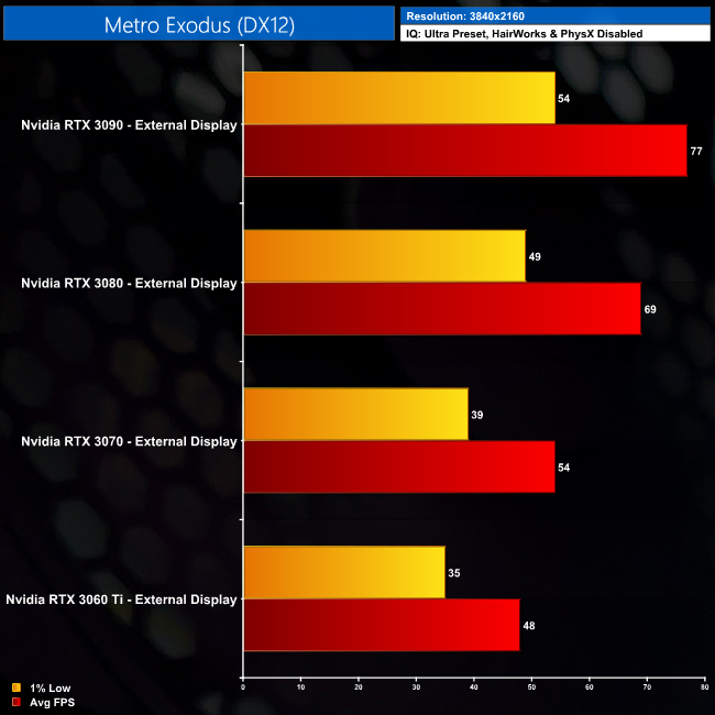 Metro Exodus is another game, like Gears 5, where scaling appears closer to what we'd expect from a desktop environment. At 4K, for instance, the RTX 3090 is 12% faster than the RTX 3080, which lines up with our previous testing. The RTX 3080 is also beating the RTX 3070 by a significant margin of 28%, which is again pretty much what we'd expect when using an i9-10900K based desktop PC.