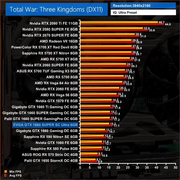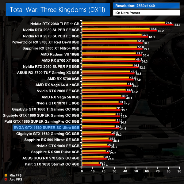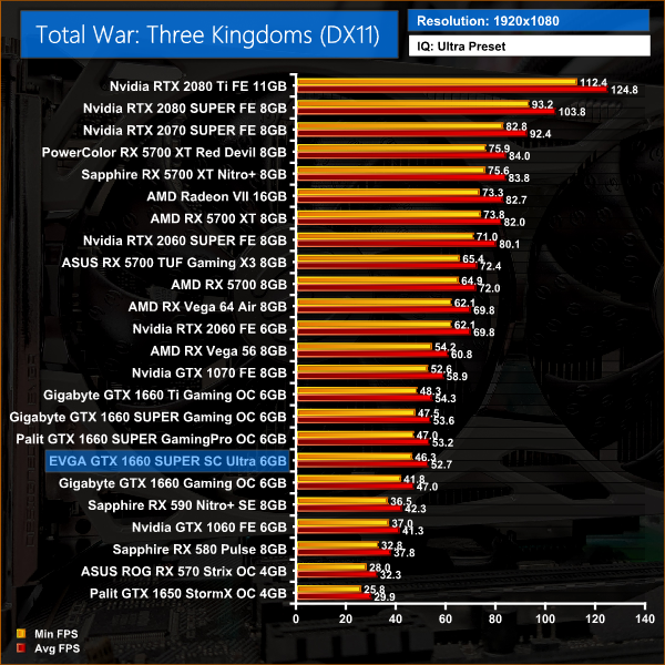 Finally, Total War: Three Kingdoms rounds things off nicely, with this EVGA SC Ultra just 1.3FPS behind Gigabyte's 1660 SUPER when gaming at 1080p, a 2% difference.
