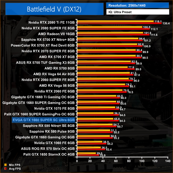 In Battlefield V, all three 1660 SUPER cards perform within 2% of each other, though it is the EVGA SC Ultra coming bottom of the three.