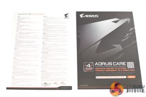 … these piece together to make a GPU support stand. The Xtreme card itself is very large and quite heavy, so Aorus includes this to prevent any sagging and potential damage to your PCIe slot. It's certainly not the most subtle way to go about this, but I think it is much better to have it than not, so thanks Aorus for including that.