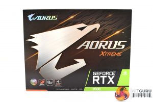 The Aorus RTX 2080 Xtreme 8G ships in a dark box with a very large Aorus logo taking pride of place on the front. There is not an image of the graphics card itself visible.