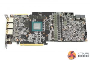 Opening up the card requires the removal of ten screws from the back of the card. This reveals a very busy-looking PCB, and the standout thing here is the mammoth 12+2 power phase design Aorus has opted for. The Founders Edition 2080, for reference, ‘only' uses 8+2 power phases, so Aorus has clearly gone overboard which it claims should help with ‘extreme overclocking'.
