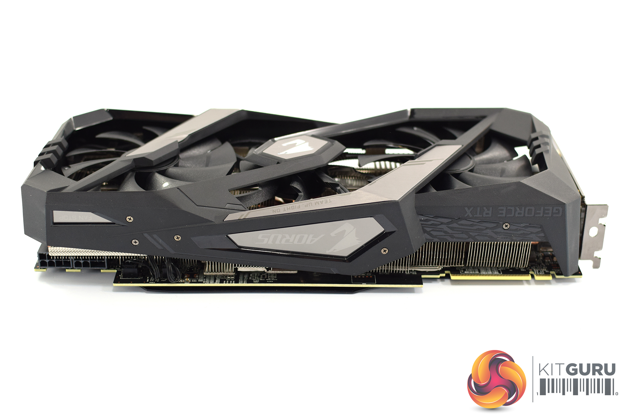 Moving back round to the front side of the card, here we find some (very) subtle GeForce RTX branding on the left-hand side, with the Aorus logo taking pride of place in the middle of the card.