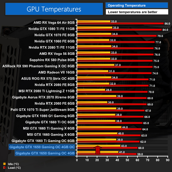 To Gigabyte's credit, the extra frequency barely affected the Gaming OC 4G. Temperatures rose by just 1C, and noise levels were essentially unchanged from the stock result. Power did also rise very slightly, but an extra 5W is really not going to bother anyone.