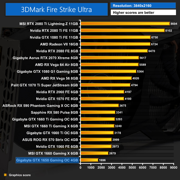 It's not the greatest start for the GTX 1650, with its results planted firmly at the bottom of our 3DMark charts. It does come closer in the DX12 Time Spy benchmark, with just a 300 point gap between itself and the RX 570, but in both Fire Strike and Fire Strike Ultra the gap is significantly wider.