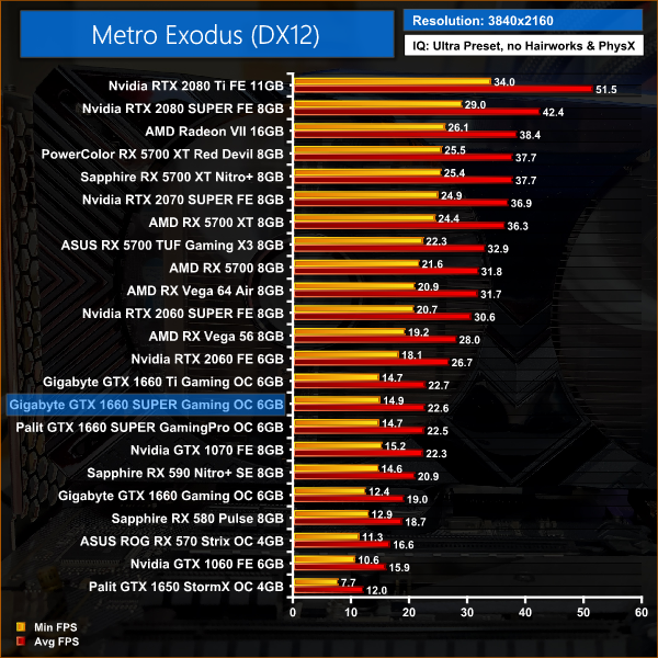 GTX 1660 SUPER outperforms 1660 by increasing margins as we step up in resolution with Metro Exodus – it's 12% faster at 1080p, 14% faster at 1440p and 19% faster at 4K. Compared to GTX 1660 Ti, it's no more than 3% slower.