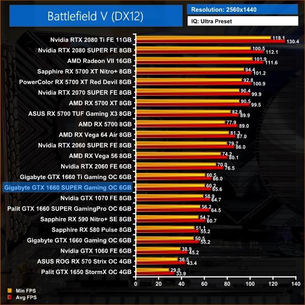 Battlefield V follows on from our 3DMark results very neatly – Gigabyte's 1660 SUPER is on average 18% faster than the 1660 in this title, while proving no more than 3% slower versus the 1660 Ti.