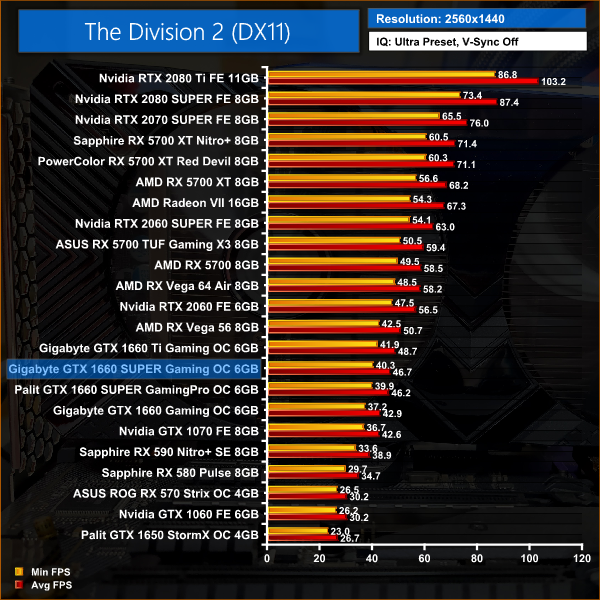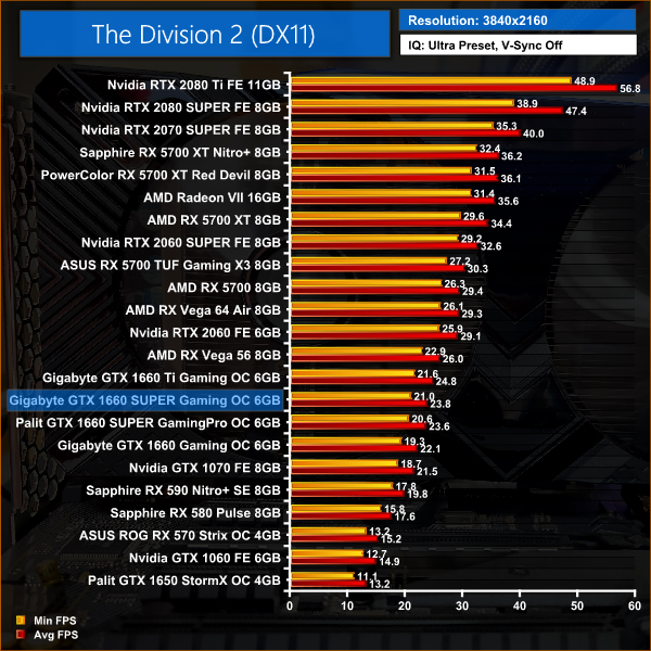 The Division 2 shows less of a gain for the 1660 SUPER, with Gigabyte's card proving 8% faster than the 1660, while it is also 4% slower than the 1660 Ti. Comparatively, the 1660 SUPER also does well up against Vega 56 here, where it's just 7% slower than the AMD card.