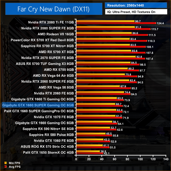 Far Cry New Dawn stretches 1660 SUPER's lead to 14% over the 1660, and it's just 2% slower than the 1660 Ti at 1440p.