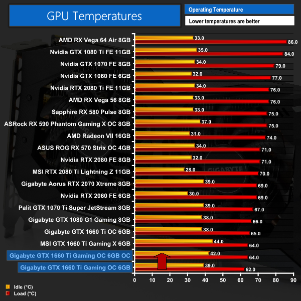Considering how – dare I say – overkill this triple-fan cooler is for a GTX 1660 Ti, it is not really a surprise that it deals with the extra heat from our overclock without breaking sweat. Temperatures did rise, but only by 2C, and with noise output peaking at 40dB, this is still a whisper-quiet card.