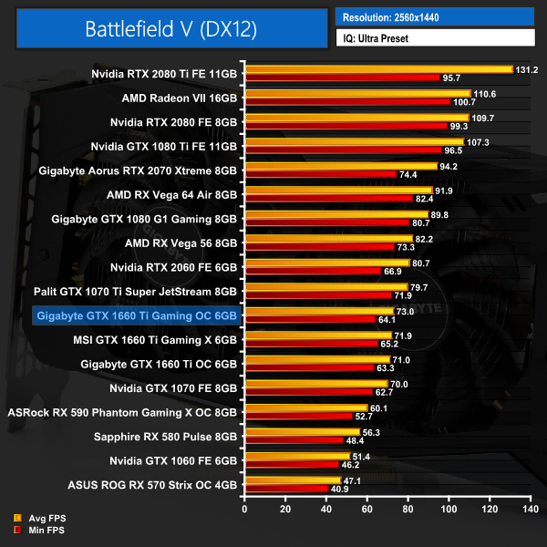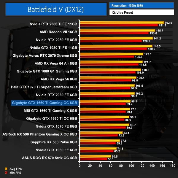 Gigabyte's Gaming OC 6G is also marginally faster than the other two 1660 Tis when we come to Battlefield V. The margins are not big, though – just 2.2FPS separates this card from the slowest 1660 Ti when gaming at 1080p.
