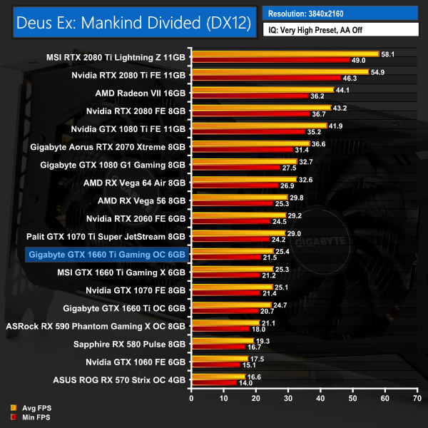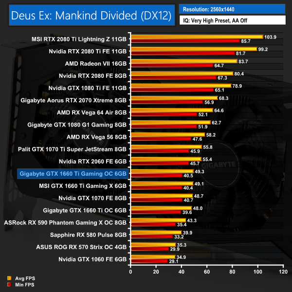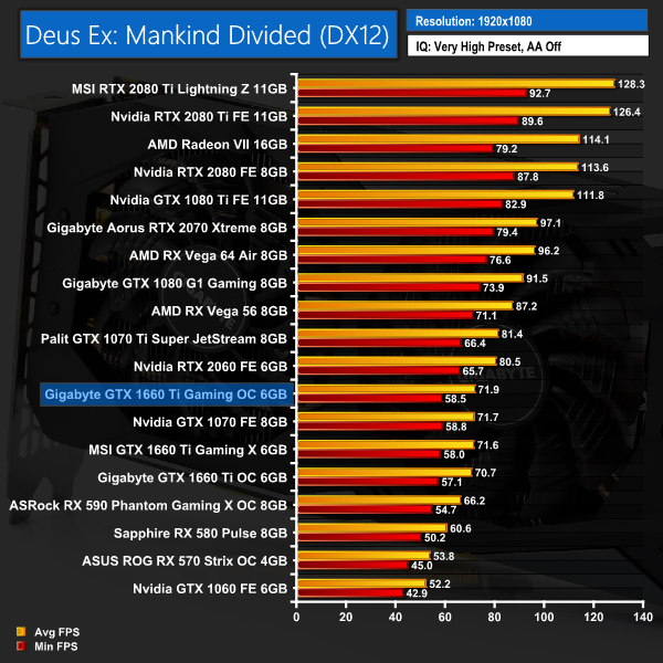 The same trend continues with Deus Ex: Mankind Divided – all three GTX 1660 Tis perform within 2FPS of each other, with the Gaming OC 6G just leading the pack.