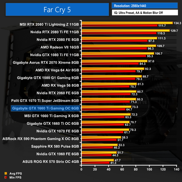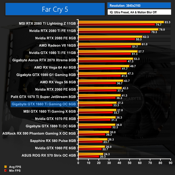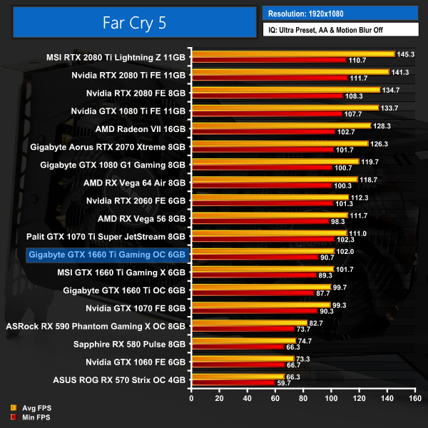 Gigabyte's Gaming OC 6G continues to edge ahead of the MSI Gaming X when we come to Far Cry 5. As you will have noticed, however, it's really a case of fine margins between all three 1660 Tis.