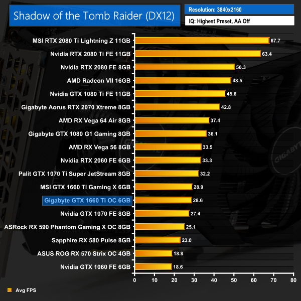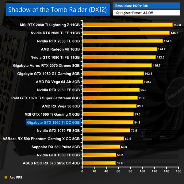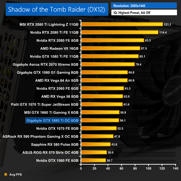 Shadow of the Tomb Raider shows the GTX 1660 Ti establishing a healthy performance advantage over GTX 1070, with another 5FPS gap at 1080p, while this drops to 3.6FPS at 1440p. The difference between both GTX 1660 Ti models is never more than 1FPS across all three resolutions tested.