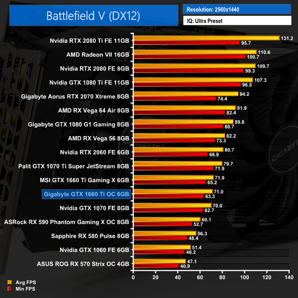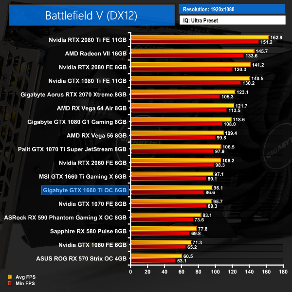 Gigabyte's GTX 1660 Ti comes in very close to the MSI Gaming X in Battlefield V. Across all resolutions, the performance difference is never more than 1FPS on average.