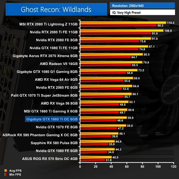 Ghost Recon: Wildlands is known to favour Nvidia hardware over AMD cards, and that explains why this 1660 Ti performs almost exactly the same as Vega 56 at 1080p resolution. Even at 1440p, the OC 6G averages almost 60FPS here.