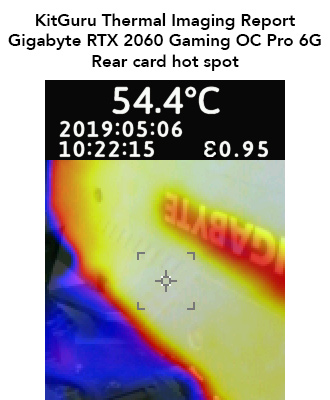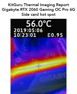 Things are also looking great when we measure the card's hot spots using our thermal gun. Here, the hot spot on the back of the card didn't reach 55C, and the side of card proved just 1C hotter. Clearly, the Windforce 3X cooler is more than capable of dissipating the heat from the TU106 GPU.