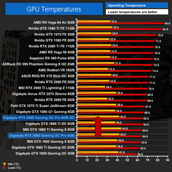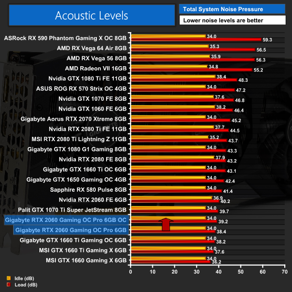 While not the biggest overclock for the RTX 2060, the upside is the card didn't suffer as a result of the extra frequency. GPU temperatures rose by just 1C, and noise levels didn't even increase by a single decibel. As for power consumption, this rose by just 6W, another trivial increase.