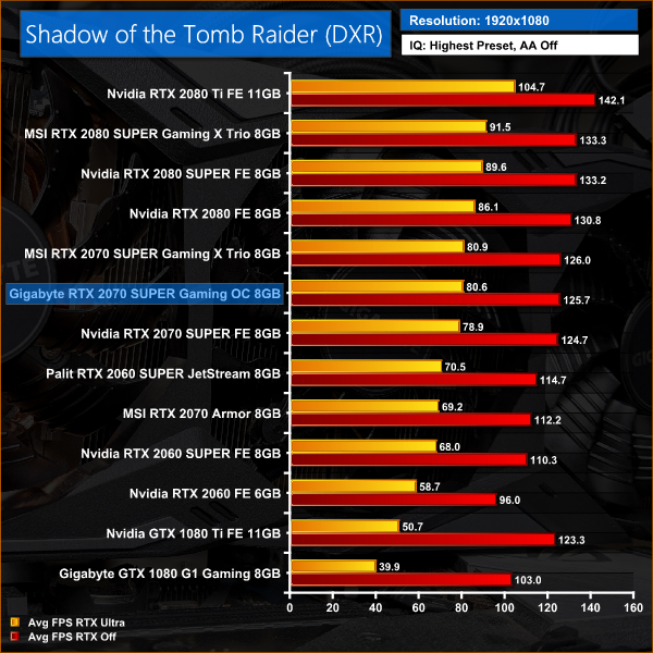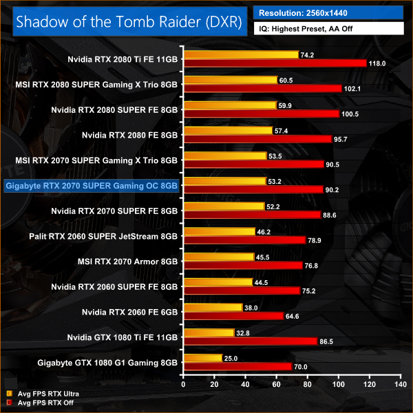 Shadow of the Tomb Raider runs at a very comfortable 80FPS when we set ray tracing quality to Ultra at 1080p. We also see over 50FPS at 1440p, though again this is still a punishing performance hit when compared to playing with ray tracing turned off.