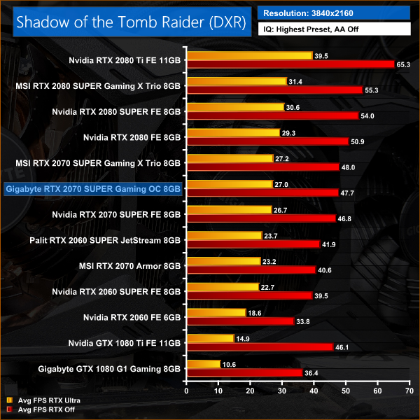 We test using the Highest preset, with AA disabled. We test using the DX12 API. For these ray tracing benchmarks, we present average frame rates for the game with ray traces shadows (DXR) off, and then again with ray traced shadows set to Ultra.