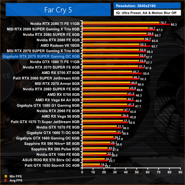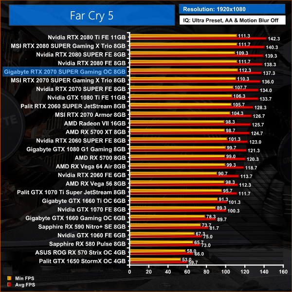 Far Cry 5, when tested at 1080p, is the only instance where we see the Gigabyte Gaming OC outperforming the MSI Gaming X Trio – at this resolution, there is a noticeable CPU bottleneck so the result is not significant. At 1440p and 4K, the Gigabyte shifts down and sits between the Founders Edition and that MSI card, though the margins are very small.