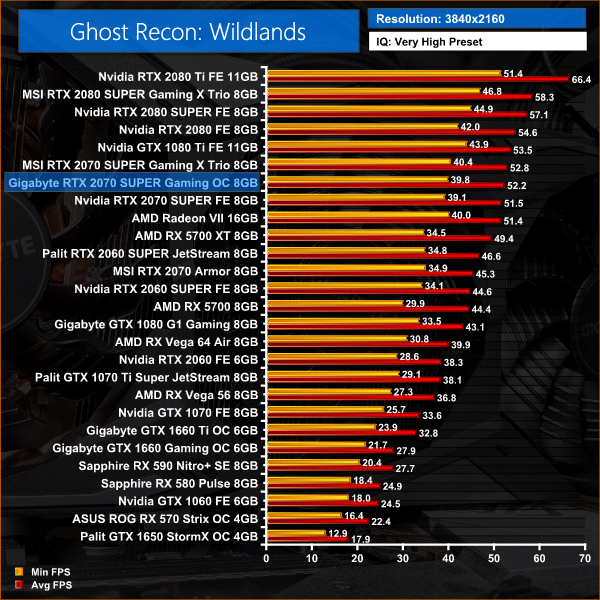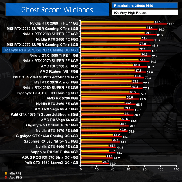 It's more of the same in Ghost Recon: Wildlands, where we see another 2% performance lead for the Gaming OC versus Nvidia's Founders Edition.