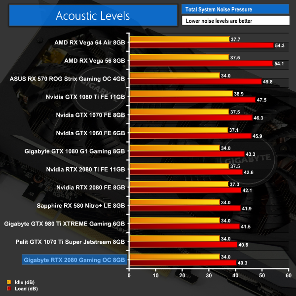 We take our noise measurements with the sound meter positioned 1 foot from the graphics card. I measured the sound floor to be 34 dBA, thus anything above this level can be attributed to the graphics cards. The power supply is passive for the entire power output range we tested all graphics cards in, while all CPU and system fans were disabled.