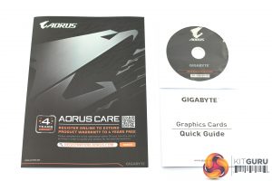 Inside the box, we find a somewhat redundant driver/utility disk, as well as one quick start guide. The larger black leaflet lets you know you can get an extra year added onto your warranty for the card by registering it online – a nice touch from Gigabyte.