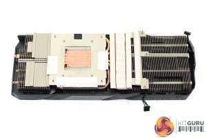Moving onto the cooler, this is obviously very different to the Founders card. The Gaming OC cooler uses 6 copper heatpipes (which look like they measure 6mm in diameter) and these contact directly with the GPU core. The large aluminium fin array makes up the bulk of the cooler, but there is also a coldplate (with thermal pads) for the VRAM chips and MOSFETs as well.