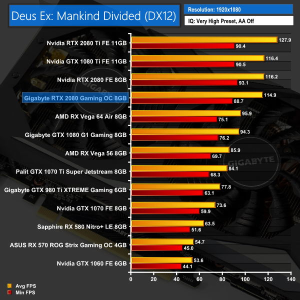 At 1080p, the Gaming OC is just behind the Founders Edition once again, but the Gigabyte card nudges ahead at 1440p and 4K. In any case, the difference between the two is only 0.4FPS at its biggest!