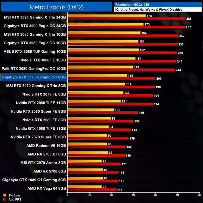 In Metro Exodus, Gigabyte's RTX 3070 Gaming OC comes in 4% faster than Nvidia's Founders Edition, at both 1440p and 4K resolutions.