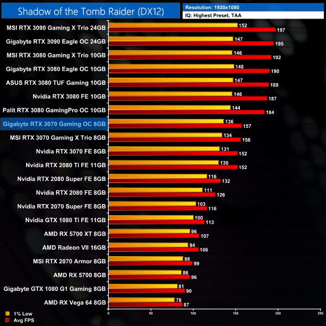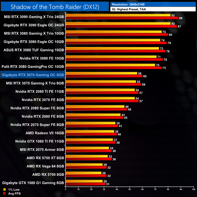 The Gaming OC produces its best result in Shadow of the Tomb Raider, when gaming at 4K. At that resolution, it is 5% faster than the Founders Edition, and 2% faster than the Gaming X Trio.