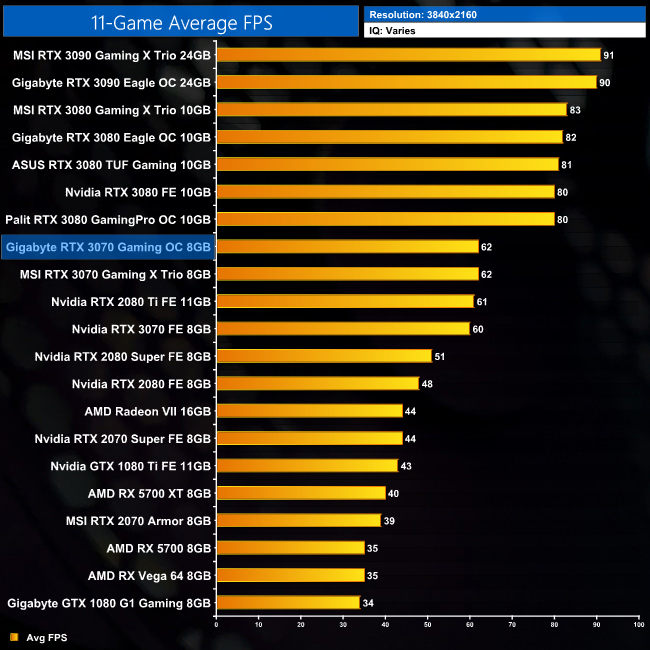 Here we present frame rate figures for each graphics card, averaged across all 11 games on test today. These figures can disguise significant variations in performance from game to game, but provide a useful overview of the sort of performance you can expect at each resolution tested.