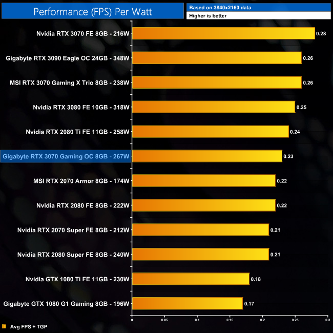 As a result of the significant increase to the power limit (+23% compared to reference), the Gaming OC is less efficient when compared to both the Founders Edition and the Gaming X Trio. The latter card offers 13% better performance per Watt.