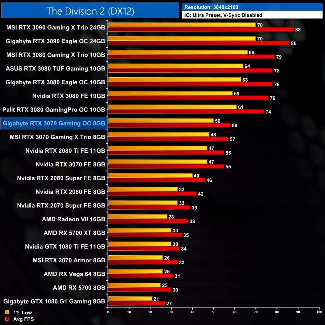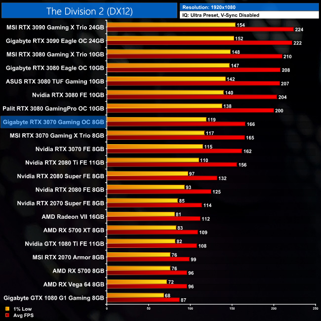 In The Division 2, at 1440p Gigabyte's Gaming OC holds a 2% lead over the MSI Gaming X Trio, while this extends to 4% when compared to the Founders Edition.