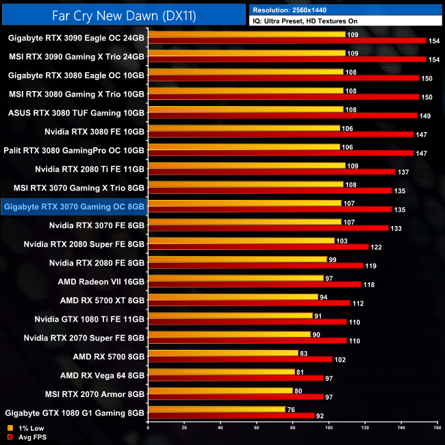Far Cry New Dawn sees the Gaming OC scale better, relative to the Founders Edition at least, as the resolution increases. It is just 1% faster at 1080p, 2% faster at 1440p and then 4% faster at 4K.