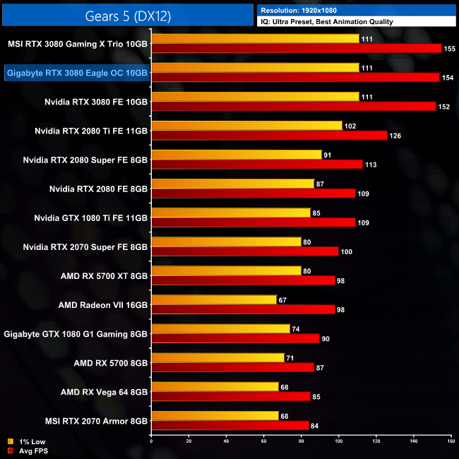 In Gears 5, the relative gains for the 3080 Eagle versus the Founders Edition increase as we step up in resolution. At 1080p, the difference is 1%, while that increases to 2% at 1440p, and finally to 3% at 4K.
