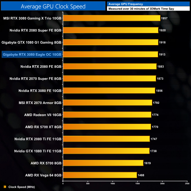 With a rated boost clock of 1755MHz, the Eagle should be about 45MHz faster than the Founders Edition. In fact, it does slightly better than this, recording an average frequency of 1913MHz across our 30 minute Time Spy stress test. This works out at 57MHz faster, on average, than the Founders Edition.