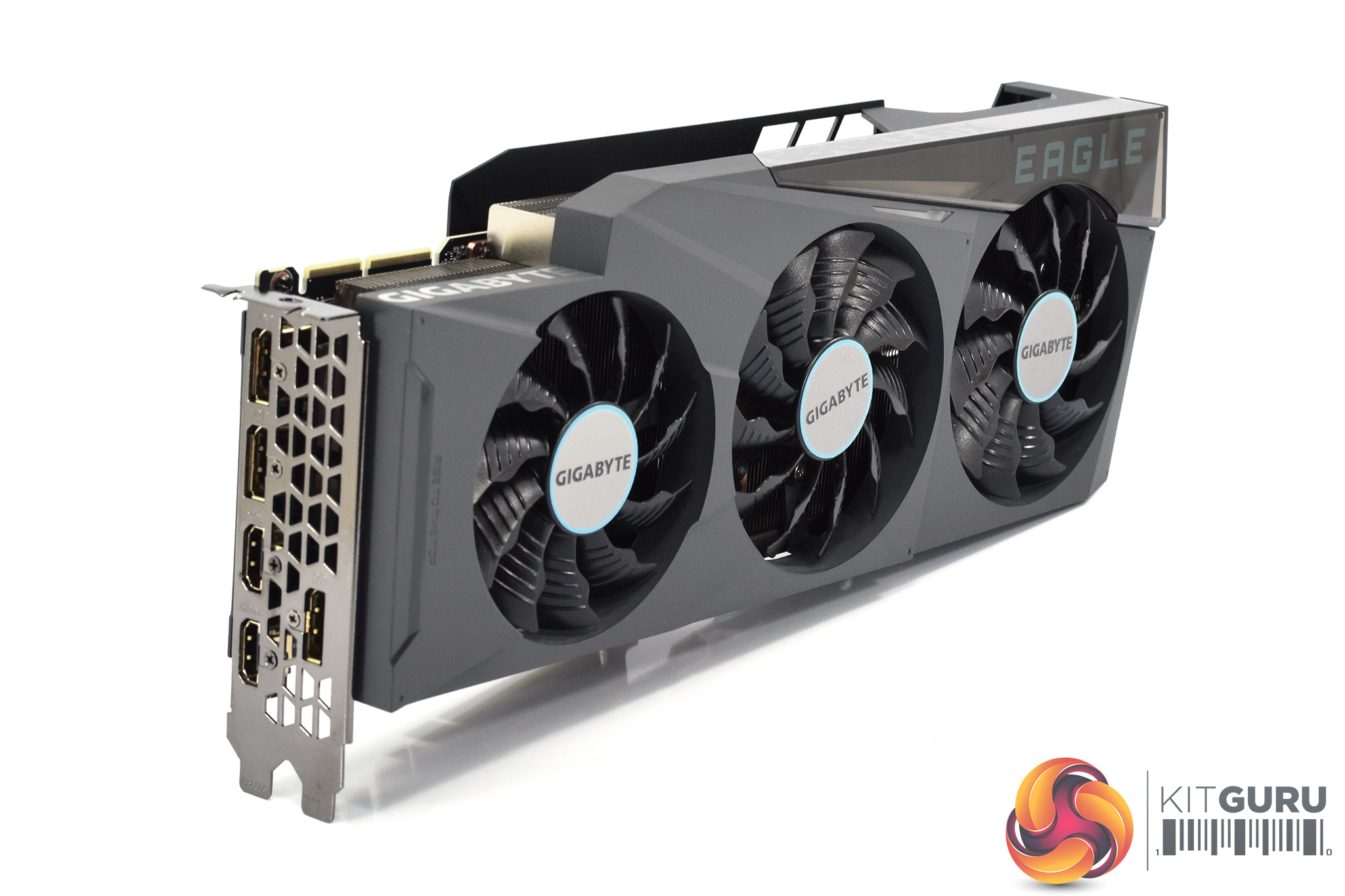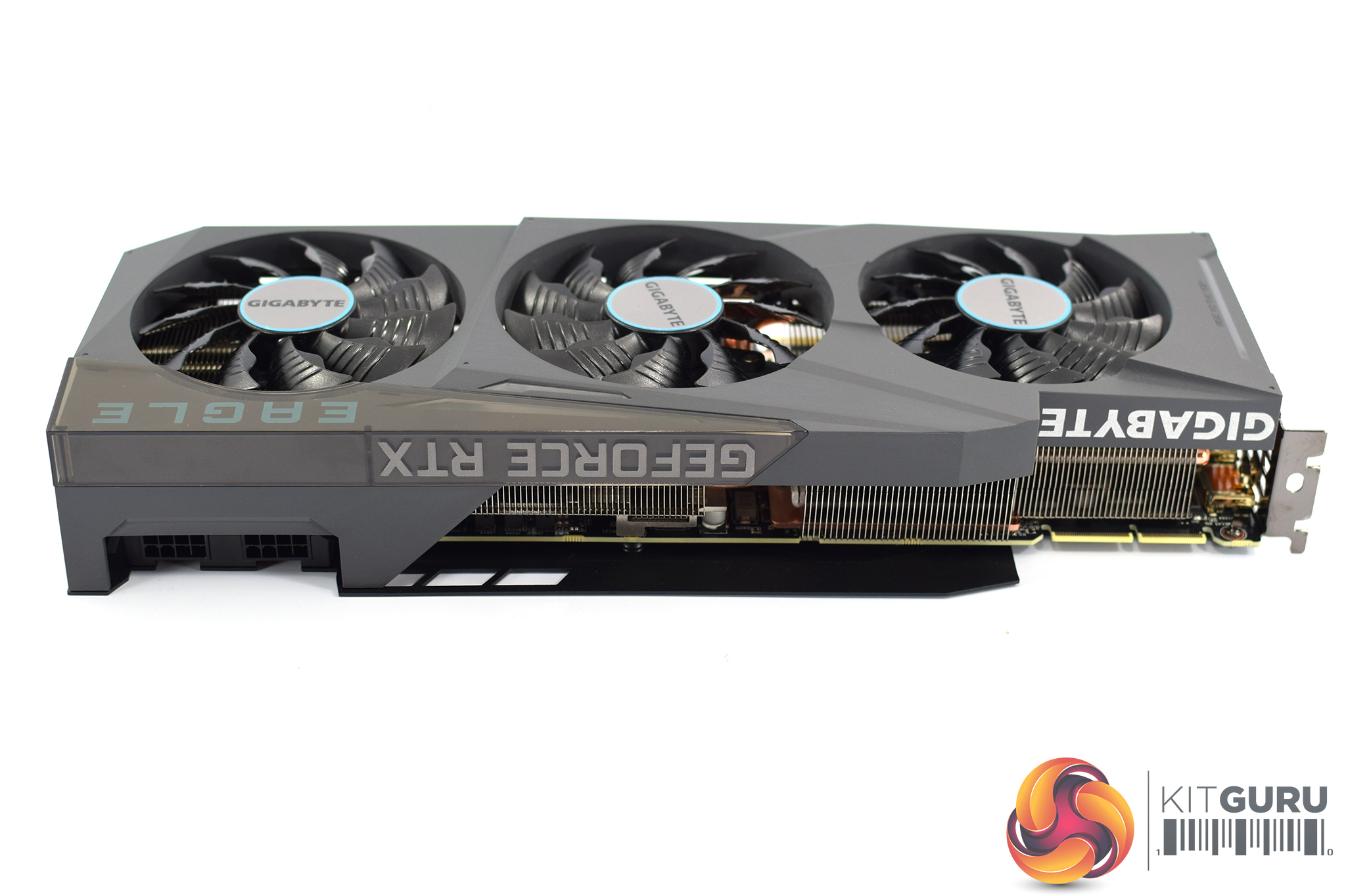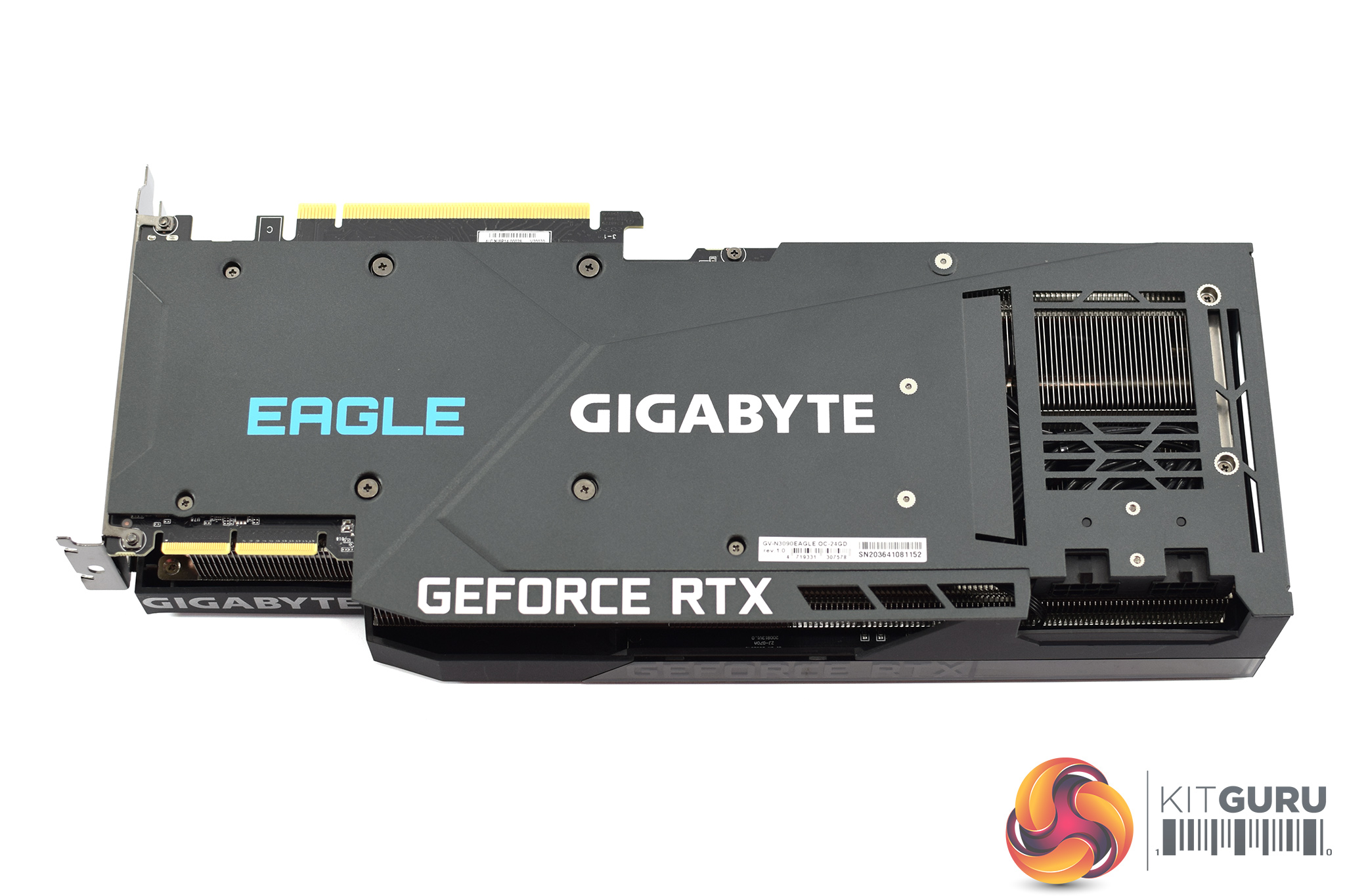 For the graphics card itself, as we alluded to on the first page, this is the exact same cooler and shroud as per the RTX 3080 Eagle OC. This means the card uses a relatively stripped-back design, with a mostly grey plastic shroud. We can also note the translucent area which is home to the Eagle brand name.