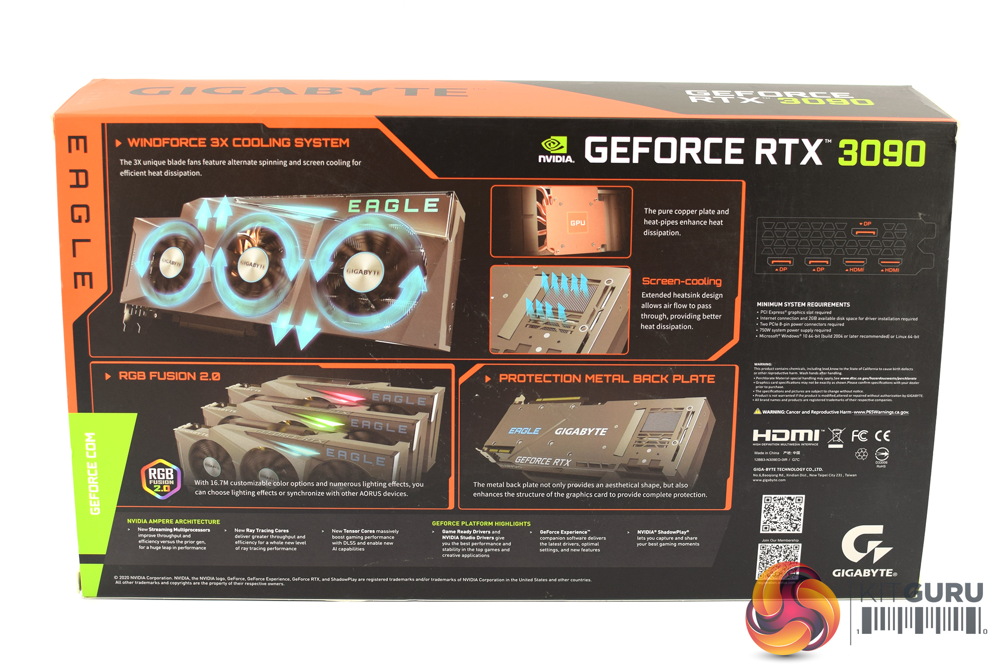 The Gigabyte RTX 3090 Eagle OC ships in a dark box, with the Eagle logo and branding visible on the front.