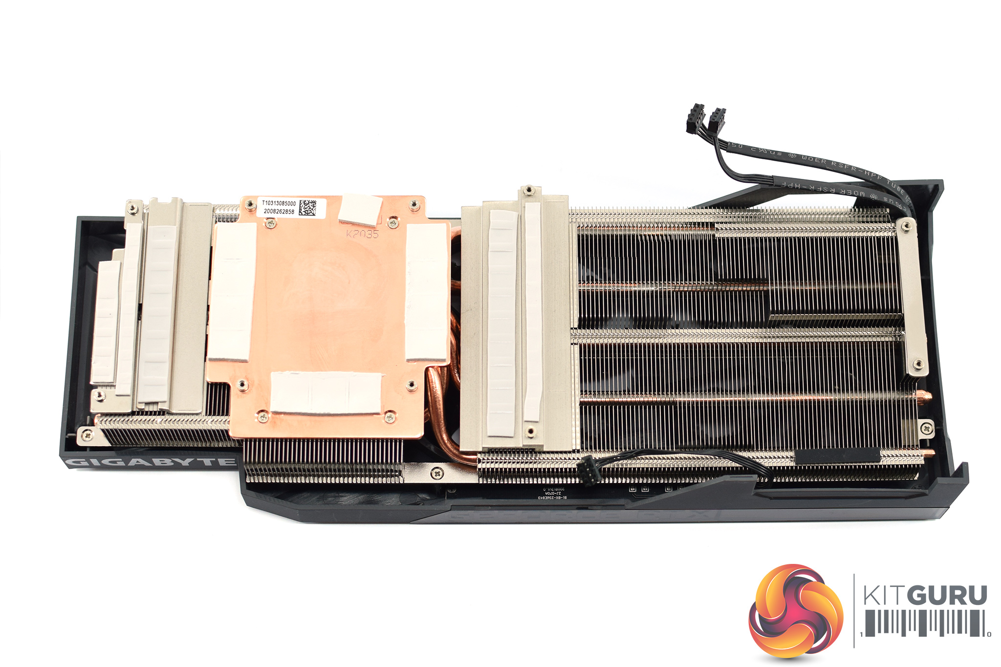 Lastly, the Eagle OC's cooler is unchanged compared to the RTX 3080 model. That means it uses two fin stacks, with a total of 7x 6mm copper heatpipes. The GPU contacts directly with a copper plate, as do the memory modules (via thermal pads). Smaller plates are also used to contact with the VRM and MOSFETs, again via thermal pads.