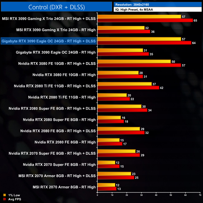 For a look at DLSS performance, we first test Control, with RT set to high, and then RT set to High with DLSS. We see an 82% uplift in performance when enabling DLSS, and this is pretty much in line with the other RTX 3080 GPUs we have tested – RTX 3080 gets an 84% boost from DLSS, while RTX 2080 Ti gets a 91% boost.