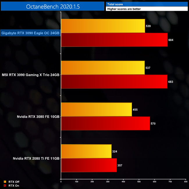 OctaneBench sees decent improvement for the RTX 3090, with scaling slightly better than what we saw in our games testing. Running the test first without RTX sees a boost of 18% for the RTX 3090 Eagle OC, when compared to the RTX 3080. Turning on RTX further increases this to 20%.