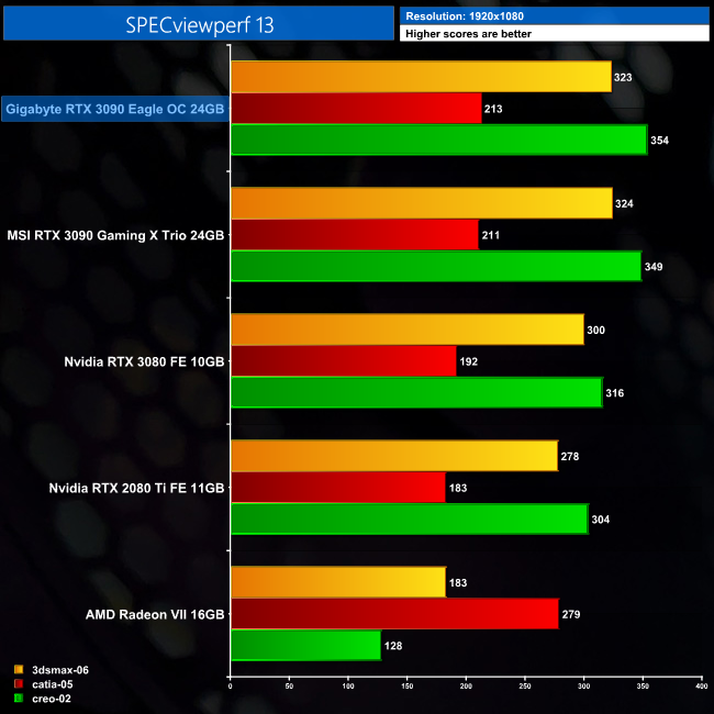 SPECviewperf 13 doesn't scale as well, however. Gains over the RTX 3080 vary from between 8-12% depending on the exact test, and even compared to the RTX 2080 Ti, we saw a difference of 18% at most.
