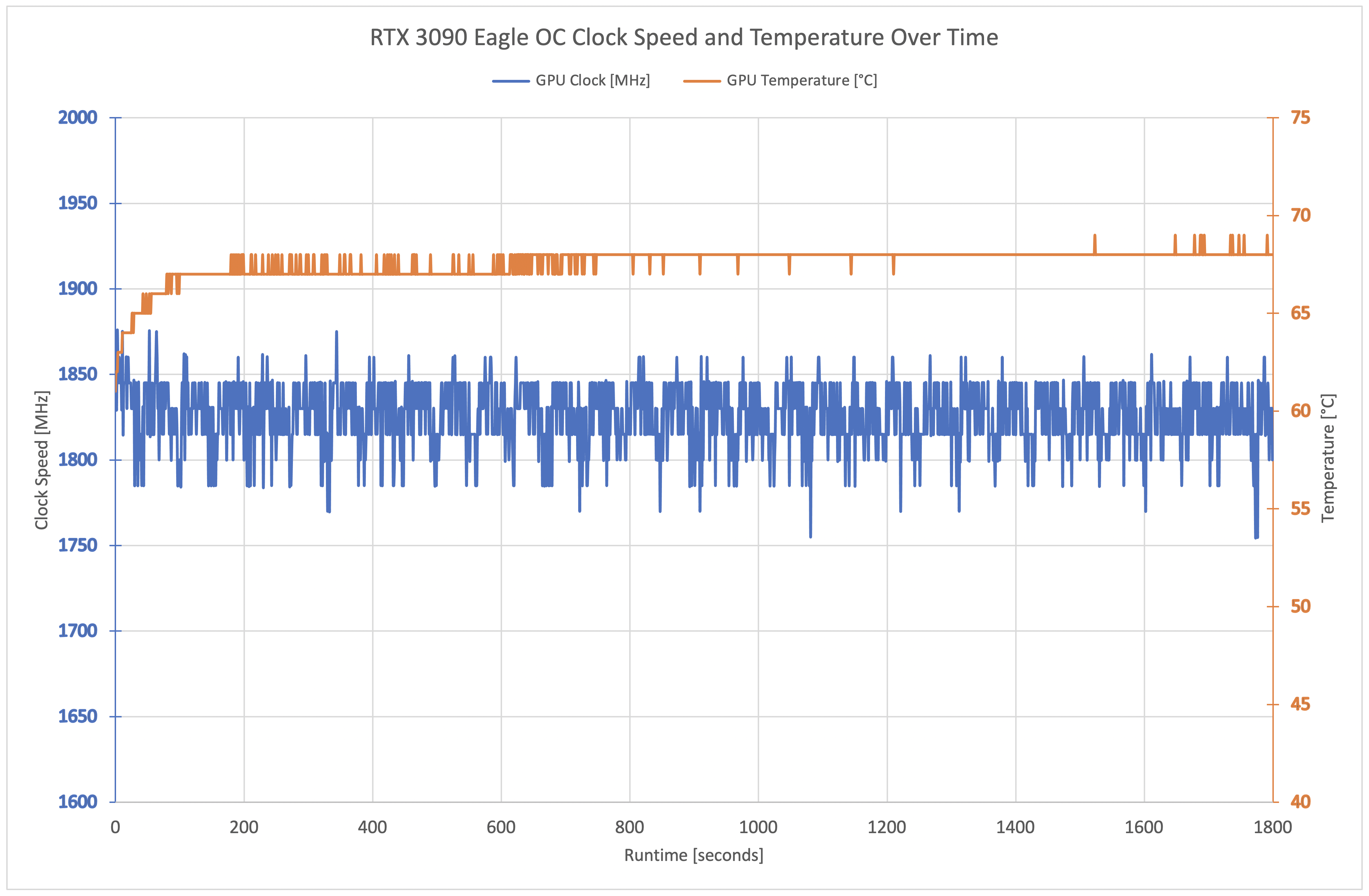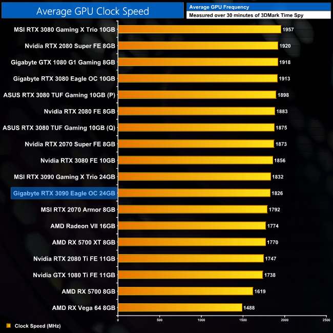 In terms of overall clock speed, the Eagle has a rated boost clock of 1725MHz, and average across our 30 minute stress test it ran almost exactly 100MHz faster than its rated speed. This is still slower than the RTX 3080 Eagle OC, but this is very much to be expected.