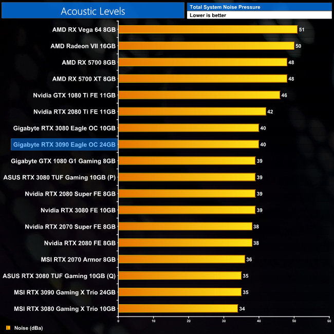 Noise levels are actually unchanged compared to the RTX 3080 Eagle OC. Where that card runs its fans at 1680rpm, the RTX 3090 Eagle OC does increase this slightly – but only to 1760rpm, and that wasn't enough for our sound meter to register increased noise levels. It's not a silent graphics card, but you'd still be hard pressed to hear it over your case fans, so I don't think this is any cause for concern.