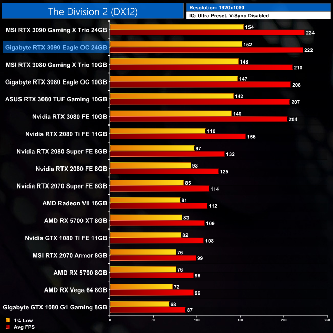 The Division 2 is a game that seems to like the Ampere architecture, and here we see the Gigabyte RTX 3090 beat the RTX 2080 Ti by a 56% margin at 4K. That makes it the single biggest increase over last generation's flagship that we will see today. Compared to RTX 3080, it's another 13% uplift for the 3090.