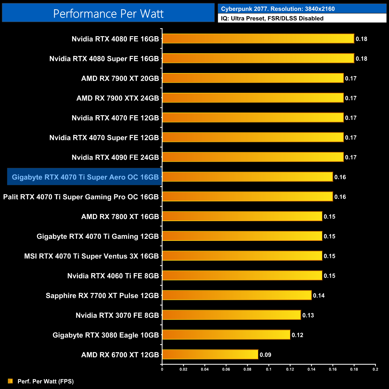 Combining the power draw values shown above with the performance data, we present performance per Watt for each graphics card tested: