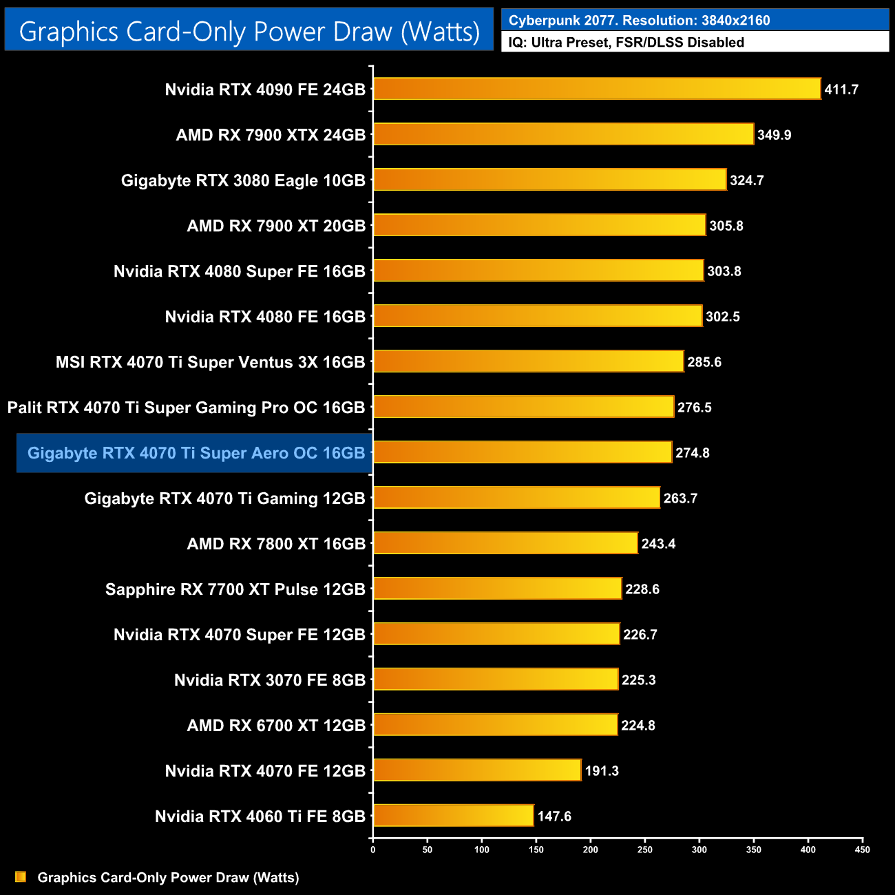 Power draw for the Aero OC came in a touch below the MSI Ventus 3X, as it hit 274.8W in Cyberpunk 2077 at 4K.