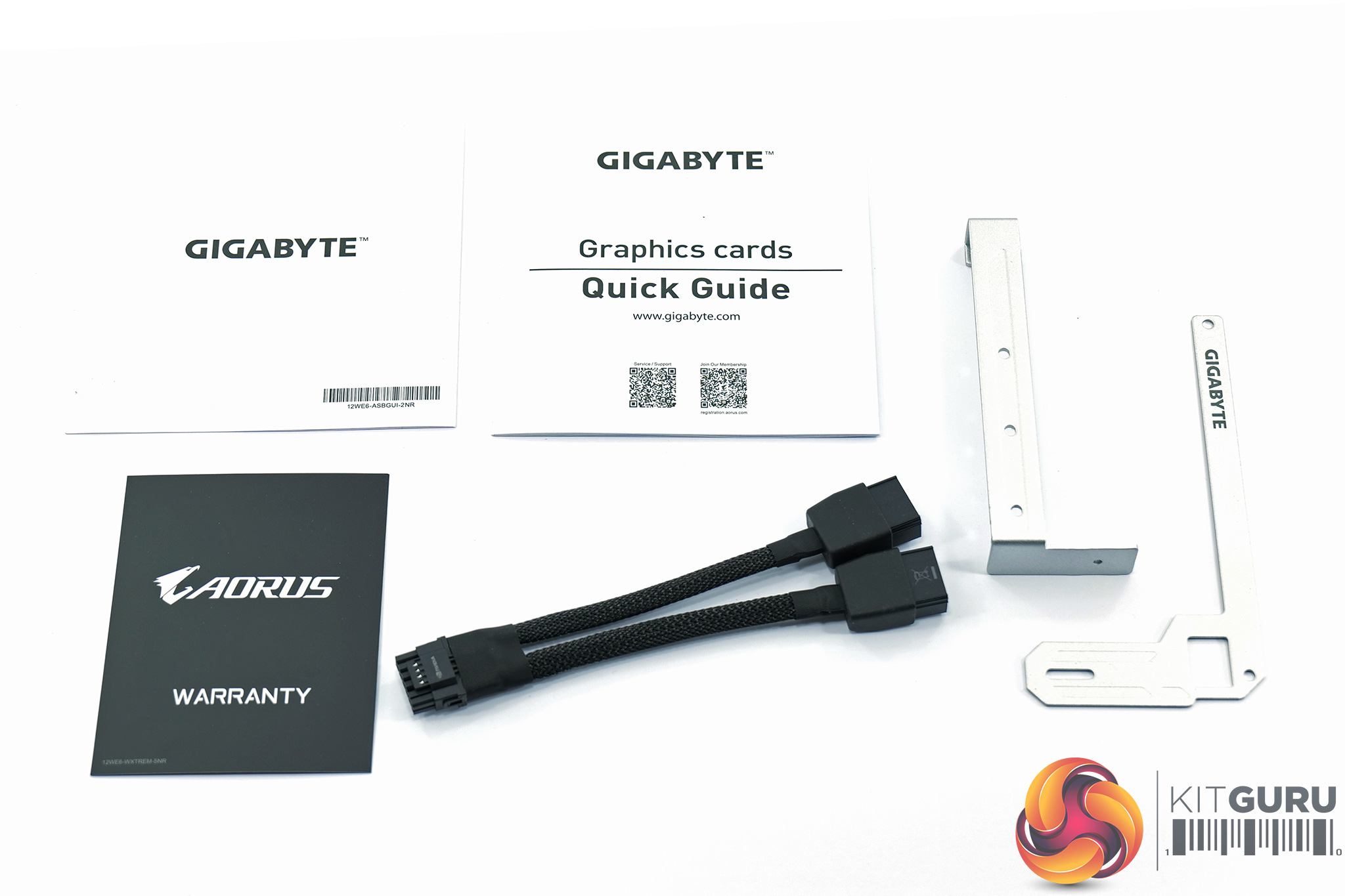 Inside the box we find a warranty note, a quick start guide, and a dual 8-pin power adapter. The final accessory is a nifty GPU support bracket that screws into two motherboard standoffs to provide a solid support for the card.